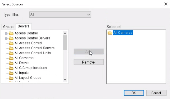 Click on the Servers tab. Select the All Cameras node and click the Add button. Click OK.