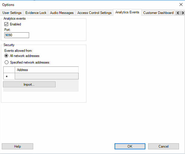 - In the Milestone XProtect Management Client, open Tools in the upper menu bar Options select the Analytics Events tab.