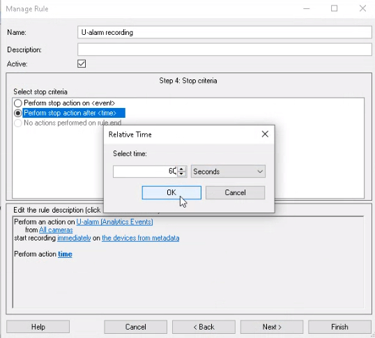 In the Stop Criteria (4) step, select Perform stop action after time. Click the blue underlined "time" word in the lower panel and set the length of the recordings. Click OK.