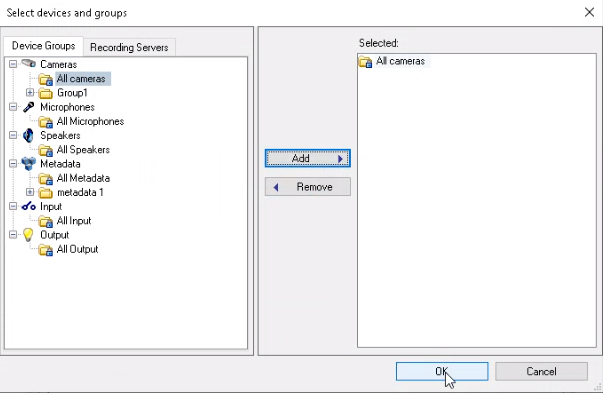 - In the pop-up, select Cameras All cameras. Click the Add button. Click OK.