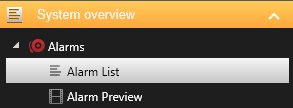 - On the left sidebar, under System overview, open Alarms click and drag the Alarm List and Alarm Preview items into the wide rectangles you created in the above step (into the two left-side rectangles in our example of a 1+1+4 grid).