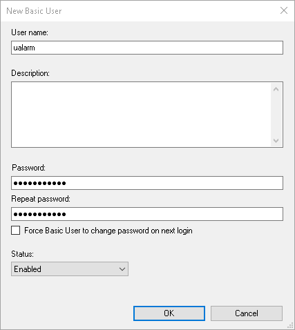 A new pop-up appears. Fill in the form with new user credentials and click OK. Use a complex password with capital and small letters, numbers and special characters.